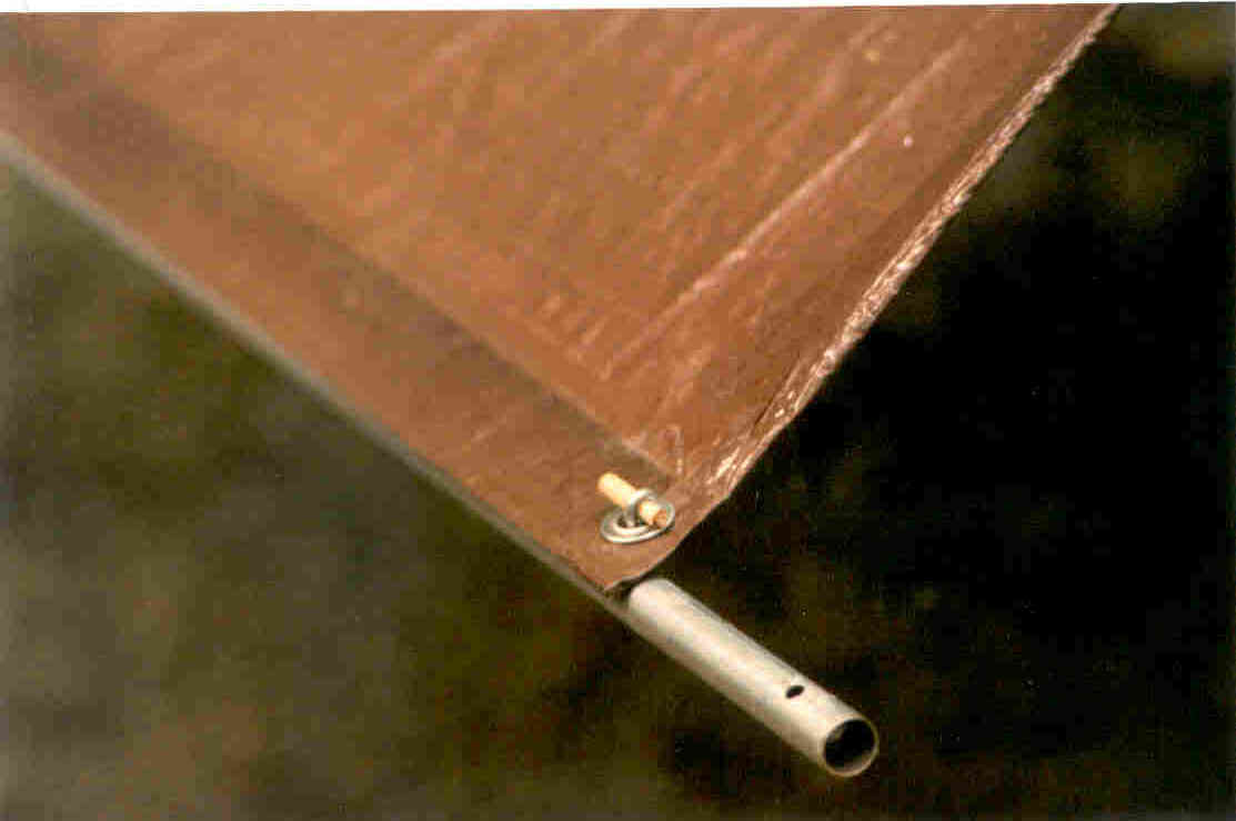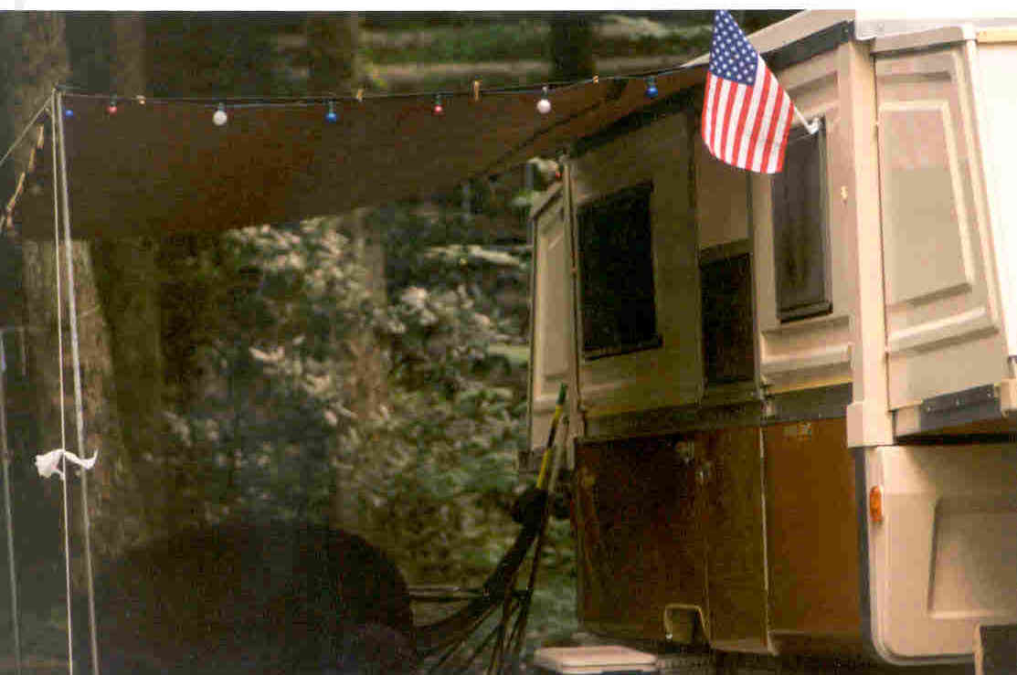 I found a rather inexpensive and effective way of making an awning. We used an 8x10' brown tarp ($5), folded a loop along one long side just behind the seam, inserted the loop into the guide rail along with 2 5' sections of 1/4" allthread (Lowes ~ $5) to hold the tarp in place on the trailer side. On the side away from the trailer I used 1 10' section of electrical conduit (Lowes ~ $3) that I drilled holes to accept eye screws in matching positions for the eyelets in the tarp (they'll slip over and you can pin them in place with dowel pins). I then rolled the conduit over to make the tarp come over the top and down in front for rain to run off then drilled a hole on each end to accept extendable tent pole tips (wal-mart ~ $10)). Once raised they are tied off using 2 stakes/pole with string. Works & looks great. Oh yea, I store the conduit on top of the awning rail with 2 screws through the holes for the tent poles into the awining rail. - Chris