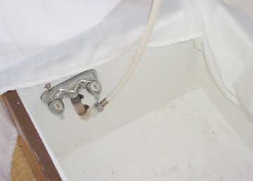 I also drilled holes for the faucet fixture. The entire inside and outside of the plywood base was then coated with fiberglass resin and the inside with some fiberglass cloth followed by a final gel coat layer (in white).