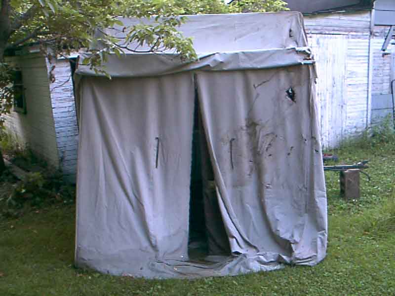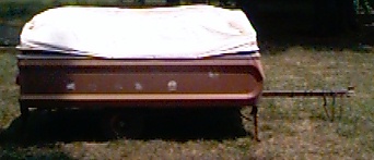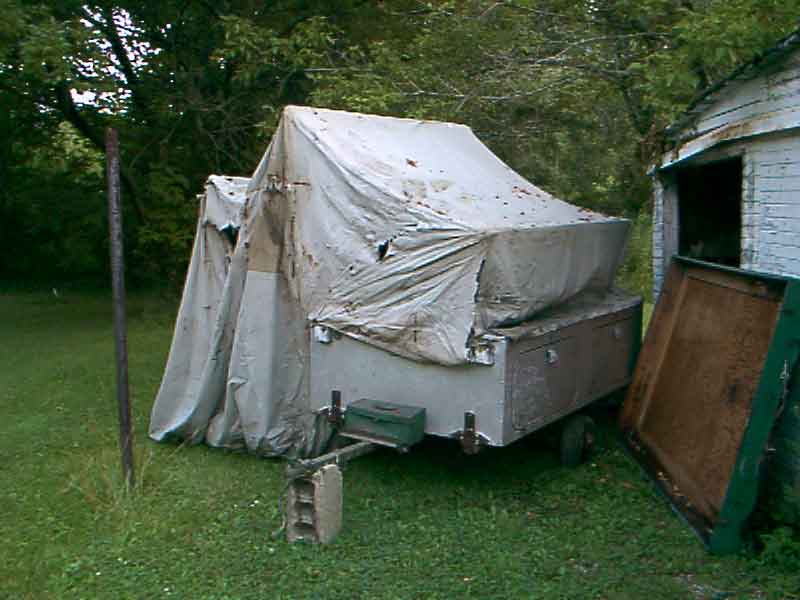 Well I forgot about it and about a month later a friend said he had seen a couple campers for sale and we went looking and then he said he remembered seeing a popup for sale for $175.00, so we drove around looking for this camper and sure enough it was the same one my father in-law saw because it was on the same road in about the same place as before. So my friend and I stopped and were looking over this tent on wheels and jabbering back and forth when this lady appears and we found out that they paid $200.00 for the camper and all the camping supplies and never set it up and about two months after they bought it they set it up and found some problems and parked it in their pole barn. Over the winter and spring a raccoon got into it an did some more damage and they decided to sell it. They set it up by the road for sale and it had been setting there for about 4 to 5 months before my friend and I stopped by. We talked about it and possible things we could do with the trailer the lady told us that we would have to talk to her husband on the price because the camper was not looking good at all so the next morning I stopped by to talk to the guy and offered the guy $20.00 for the trailer after a little haggling we agreed on $50.00. He folded the canvas up and put it in the trailer and told him I would be back a little later to pick it up about an two hours later my friend and I stopped to pick up the trailer and the guy remembered there were more parts in the barn and brought them out for us and we put all the stuff in the back of the truck and towed it home the whole two miles.