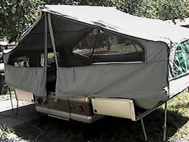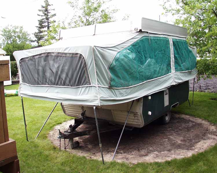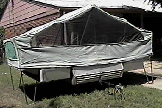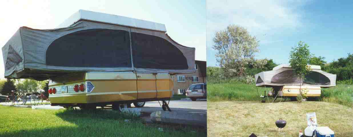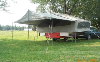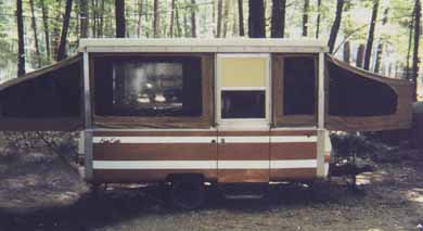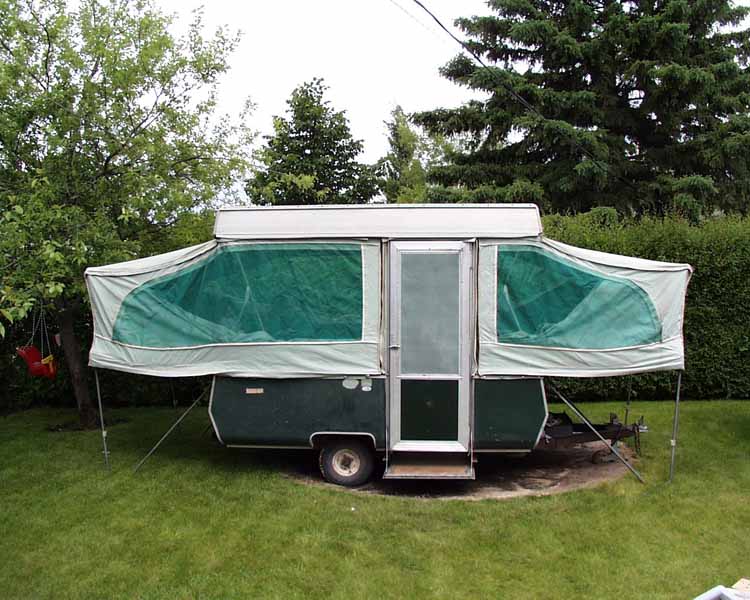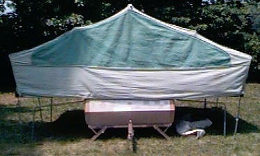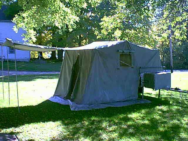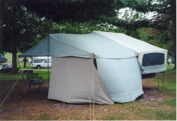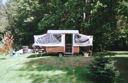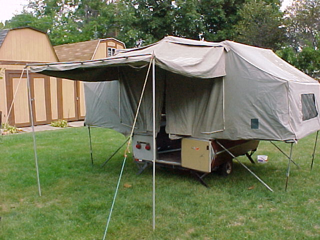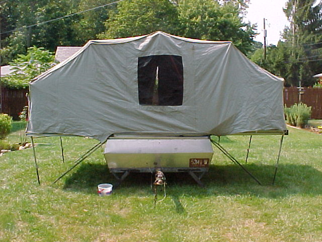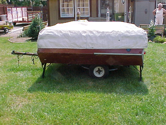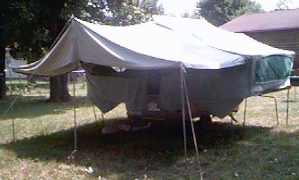 I have a 28 foot '72 Sycamore in nice shape and like to camp and like most campers I have a seasonal site at a campground and from time to time I take off and make little trips and toting my big camper around is ok but I was looking to get a popup for my little trips here & there. My father in-law and I were on our way to MIS for the NASCAR races which we make into a weekend and he saw this popup for sale for $175.00. I missed it for it was on his side and we talked about how much better it would be then in the tent we camp in.