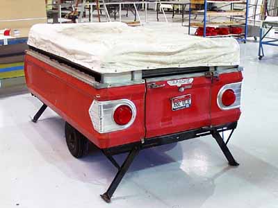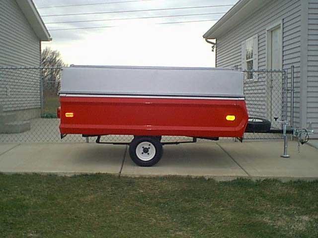 Here are some pictures of my Apache I've been restoring the past winter. It was for sale on the side of the road for $50.00. I got em down to $40.00. It was in bad shape when I got it home. The canvas was filled with mice holes everywhere and the floor was rotted through. I took the camper down to it's frame and went from there. The original metal and aluminum top was still in good shape. The camper has been upgraded to newer standards. I also have intentions of adding an AC Unit. The color I painted the trailer is Rustoleum safety red. All I need is a new canvas to go camping!!!!! I had no idea how much a new one would be ($800.00) before starting the project. Oh well , I have come this far I might as well complete it. I have had many offers on the trailer already!!!! I will probably use this year and then upgrade to a bigger popup. Thanks - Todd Michigan City, Indiana
