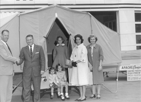 My parents owned an Apache dealership in Canton, MA, and this pic shows my parents (father on the left and mother on the right) after they had raffled off a '62 Apache Eagle to the family in the middle. The other pic is of my mother in our VW delivery car with a '63 Apache Eagle. The body was yellow (or cream) with a solid 2 piece white road cover. We took this combo on many a trip in the sixties. - Barry