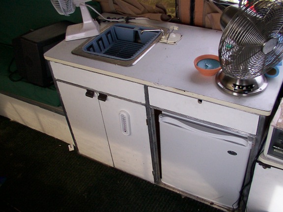 cover over the funky 60's wood grain, and a new, small dorm fridge was installed