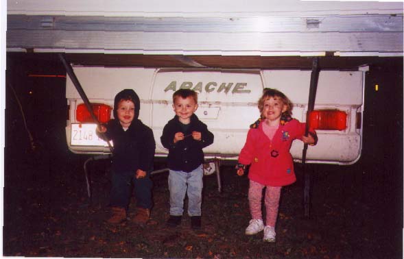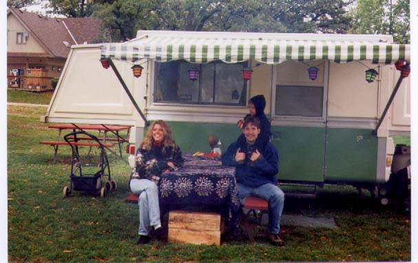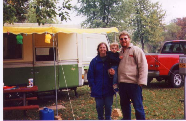 What a great time! What a great group of folks! 5 Apache campers and 13 people showed up for the 1st ever Midwest Apache Roundup. There were two 1975 Royals, one 1975 Ramada, one 1978 Yuma, and a 1965 Silver Eagle. The four hard-sided Apache's were all green! We set up in a big circle and what a sight it was! Harry and Kathleen arrived from Illinois in their '75 Royal with their son Harry and two wiener dogs. Myself (Doug) and Heidi came from Illinois in the other '75 Royal with our son Ben. Dennis and Rene were from Illinois in their shining '75 Ramada with their daughter Sierra. All the kids were two, and they had a blast together! Ironically, the three families had so much in common it was spooky! Robert and Irene arrived from Michigan in their '78 Yuma with their poodle, and Paul and Karen came from Wisconsin in their '65 "Green Bay Packers" Silver Eagle. Everyone got along wonderfully and the only mishap of the weekend was a bee sting on Heidi's neck (OUCH!) Luckily Irene saved the day with some homeopathic doctoring!