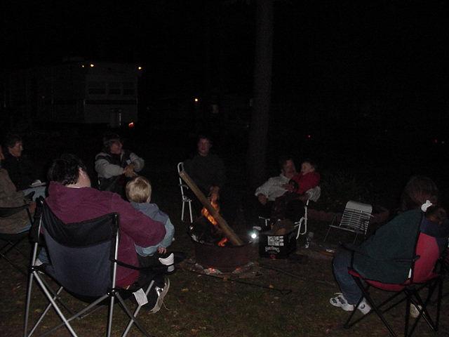 We pooled our firewood and kept the camping heater going until after 11PM. Dave even tried to warm up the whole campground with his infrared LP fired heater. A very enjoyable evening of conversation with the kids keeping everyone on their toes. Amazing how the kids and the moths are drawn toward the fire. We didn't try to keep the moths out though. Dennis did a fantastic job of keeping the sparks flying while making sure that the fire poker didn't get too cooled down. We livened it up a bit with a couple pieces of "Blue Oak" that we had left. It is amazing how relaxing it is watching a campfire.