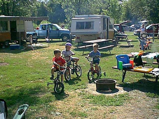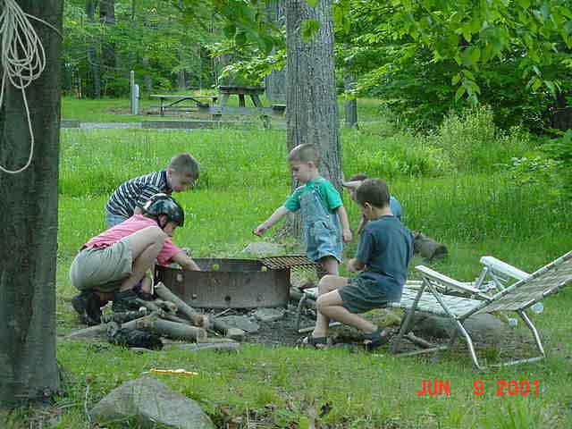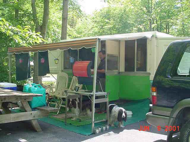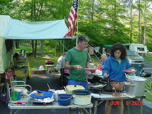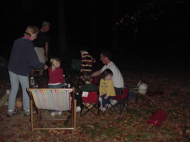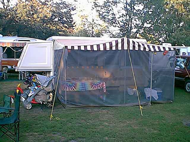 Hi all. I had to take a while to rest up from that wonderful weekend at Promised Land State Park. Boy, did I pick great weather or what! The Kanes (Bill and Bonnie) had to move into a larger Apache since June. They brought their 1978 Roamer for the trial run. Rich and Katrina (don't think I spelled that right...) were there in their 'big blue tarp' with a little bitty Eagle underneath. I just couldn't get the Raven out of the garage so we had to make do with an off-brand for the weekend. We started the usual way with a little campfire on Friday night for some R&R time. Then off to bed for a good nights sleep.A late start Saturday morning lead to getting back together in the early afternoon to help and watch the Kanes setting up camp. We pooled our resources and had a nice pot luck dinner. A pot roast and veggies so tender you didn't need a knife, a nicely spiced pot of de-gassed chili and rice (took some of the fun out of Sunday for me), and a big pot of New England clam chowder and crackers rounded out the feast for the night. I think everyone held back on the dinner fixins so they could max out on the marshmallows and smoores around the campfire. At least the kids did. I wonder if marshmallows come in industrial size bags...?