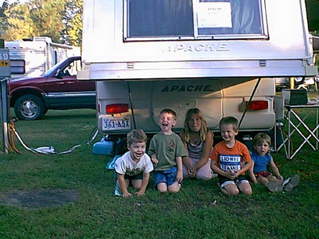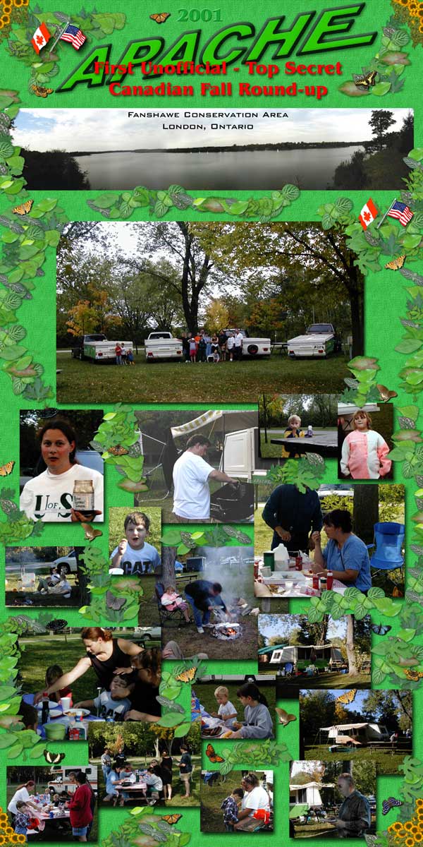 Hi Doug, We had a gathering of Apaches at the Fashawe Conservation Area just outside of London, Ontario this past weekend (9/23). What a beautiful spot for fall camping! It was in part an unofficial Round-up. Attendees included Bonnie and Mike and their three children from St. Claire Beach, Ontario - Theresa and Dave and their two children from Oakville, Ontario - Mo and Connie Bengry from Rochester Hills, MI. and Tiffany and myself with our two children from Auburn Hills, MI. Sorry that Les and Mark and their family's could not make it, you were both missed. Friday night as Mo and myself pulled in it rained heavy and hard. Everyone pitched in and we were leveled and set up in under five minutes. NASCAR pit crews have nothing on a crew of Apache people setting up a camper!!! As soon as we were set up wouldn't you know that the rain would stop and the skies would clear. It was great seeing everyone again and the weekend was definitely too short. My kids cried as we pulled away begging for one more day. I do sympathize with them. Our best times camping have been in Canada and these are truly good friends. I have attached a collage of the weekend activities. Next year Michigan in the spring, EH!? Tim.