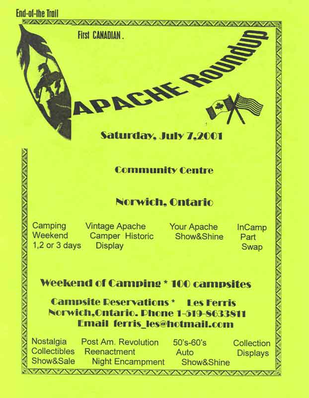 ...We just came home from a very wonderful 1st Canadian Roundup in Norwich, Ontario, a superb event organized by Mr. Les Ferris. We have made many new friends from Brantford, Ont., Florida, Kitchener-Waterloo, Ont., Michigan (including Ole and Mrs. Elmer), Norwich, Ont., Oakville, Ont. and Wisconsin. An excellent time was had by all camping families in attendance and we cannot wait until the planned U.S. National Roundup in Michigan next summer. Bonnie and I are proud to be counted among our friends within the Apache family.