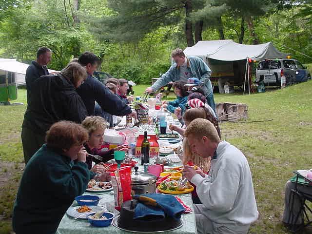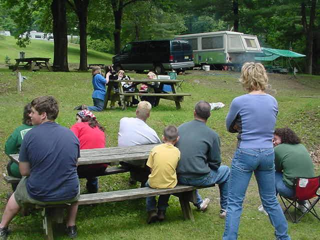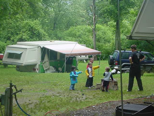The June 14, 15, 16 gathering at Interlake RV Park in Rhinebeck, NY started on a very wet note and ended with the sun coming out as we packed to leave. Unofficially...Rhinebeck no longer is having a drought! It rained and misted all day Friday on into Saturday morning. With a few breaks in the rain we were able to get set up for the fun. No dampened spirits for this group. It continued to rain and mist off-and-on through to Sunday lunch time.All but one of the 7 families showed up Friday (I won't mention which one Rich). Unfortunately, we did have one cancellation. We spent the evening with reintroduction's and welcomed two new families to the adventure. The Davies were out on their first outing with the camper. The Weinns were out for their first long-distance haul with their newly acquired camper. There were a couple new tarps added by Saturday morning to keep the wet on the outside and off our heads.It was a very nice mixture of new and returning families. From young to not-quite-so-young. I can remember when one of the attendees was at her first Roundup taking a bath in a plastic dish tub. Wow! This is our 4th year doing this. Maybe I'll do another this October.The potluck dinner was again wonderful. So much food and so little time. I didn't think anyone would have room to eat marshmallows and pudgie pies from the campfire. I was wrong. Ken, the "campfire expert" had such a great fire going that we all forgot about the wet and just grabbed our umbrellas and raincoats.The skies tried to wash us away overnight Saturday. By morning we were all ready for the potluck breakfast. More food than you could shake a stick of firewood at. Chocolate chip, blueberry, apple pancakes. Sausage, eggs any way you wanted them, bacon, great toasted bread, frogeye salad, yellow watermelon. You name it, it may have been there.The sun finally peeked out about noon as we were breaking camp. That made the sad job just a little easier to do.I think everyone had a good enough time to try another one. I know Val and I sure did.Thanks to everyone that came. Without you, it is just another weekend camping.Jim and Val (I can't believe I didn't quit after the first one)