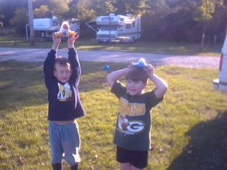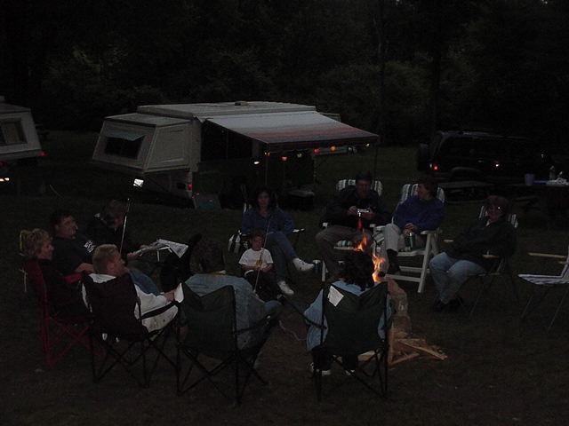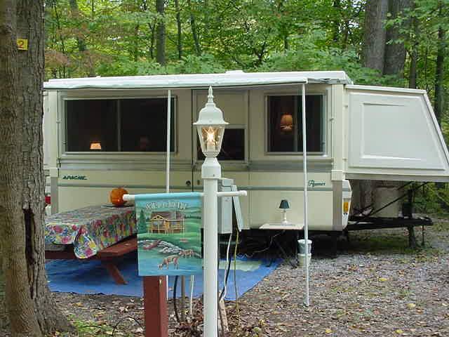 The roundup was held at Pinch Pond Family Campground in Manheim, Pennsylvania October 18-20.Hi all,The PA October Roundup at Pinch Pond near Manheim PA was great. In spite of the weather on Friday night and part of Saturday, we still had a good time. The group was small, only 4 camper families showed up. But that didn't make it any less enjoyable. We had two new families join us this time. Bob and Cindy Gresh with their great looking Roamer(? sorry if this is wrong) with the great front yard post and "double refrigerator" options. John, Sally, and Emmett McCarthy with their Ramada with the rope lighting inside. It is always interesting to see what others have done to make their campers personalized. Tom, Melody, and Jonathan Schardt joined us again. Their HUMOUNGUS add-a-room would fit a whole family itself.