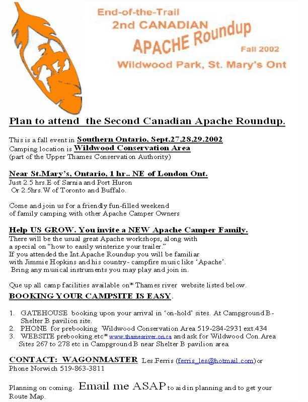 The Second Canadian Apache Roundup took place in Southern Ontario, Sept.27,28,29 - 2002 at the Wildwood Conservation Area (part of the Upper Thames Conservation Authority)