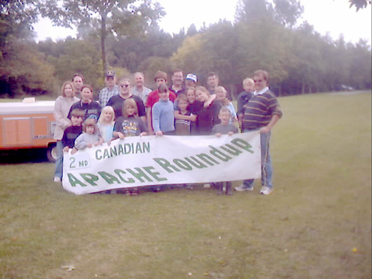 We had 7 Apaches show up at the 2nd Canadian Apache Roundup. Friday was wet for some setting up and cold but the rest of the weekend was real nice. In all we had 3 pot-lucks, of course lots of Apache talk, great walks in the woods, campfires, country music with the Apache song and the Spit Tobacco song. We ended with a group picture and promised to meet again.