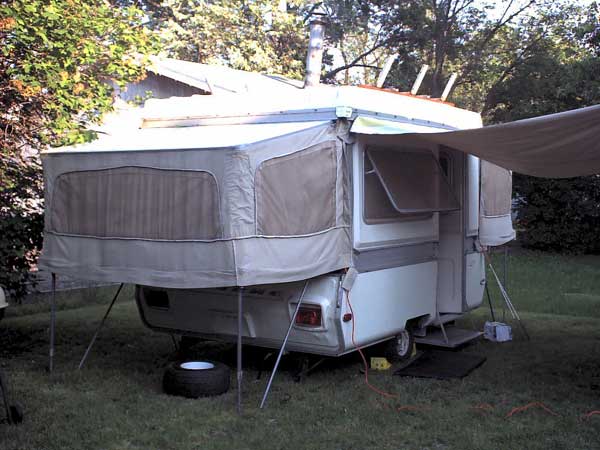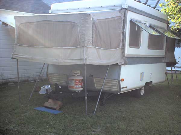Me and my wife have been together for 8 years and married for 6. She wasn't much into camping when we met, but some coaxing and begging got her to go and eventually, whattya know, she started liking it. We tent camped up to last summer when we learned that our second child was coming. Our first was a girl, who is named Emily and is now four and loves camping. Tent camping was getting a little tiresome with packing up the truck unloading the truck and all that goes with tent camping, like the weather, in which we got caught in one time. It was a pretty strong thunderstorm. Emily was 1 at time - didn't seem to bother her, she slept right through it - mom and dad didn't. We decided to maybe move up to at a pop-up camper. We were not the richest people in the world. I searched and searched for the right one and at the right price.